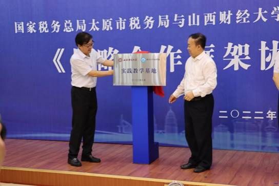 随后,yl7703永利经理赵文生,太原市税务局党委书记、局长刘世伟分别代表双方签订战略合作框架协议,yl7703永利副经理刘生旺和太原市税务局党委委员、副局长冯喜良分别代表双方签订实践教学基地共建协议书、税收科研基地共建协议书。协议书签订后,双方共同举行了揭牌仪式。